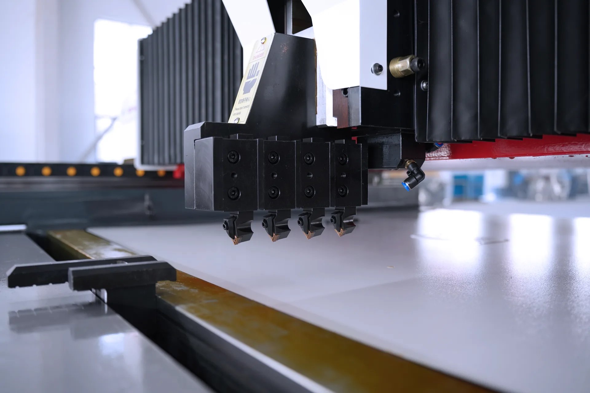 Trilho com ranhura em V de precisão, corte perfeito da chapa. A tecnologia avançada garante a precisão de cada corte em V, proporcionando o pré-tratamento ideal para a dobra. Um total de 4 cabeçotes de corte, tornando você mais eficiente.