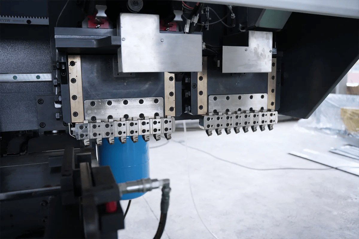 Trilho guia duplo com ranhura em V de precisão, corte perfeito da chapa. A tecnologia avançada garante a precisão de cada corte em V, proporcionando o pré-tratamento ideal para a dobra. Cada conjunto possui 8 cabeçotes de corte, totalizando 16 cabeçotes, aumentando sua eficiência.